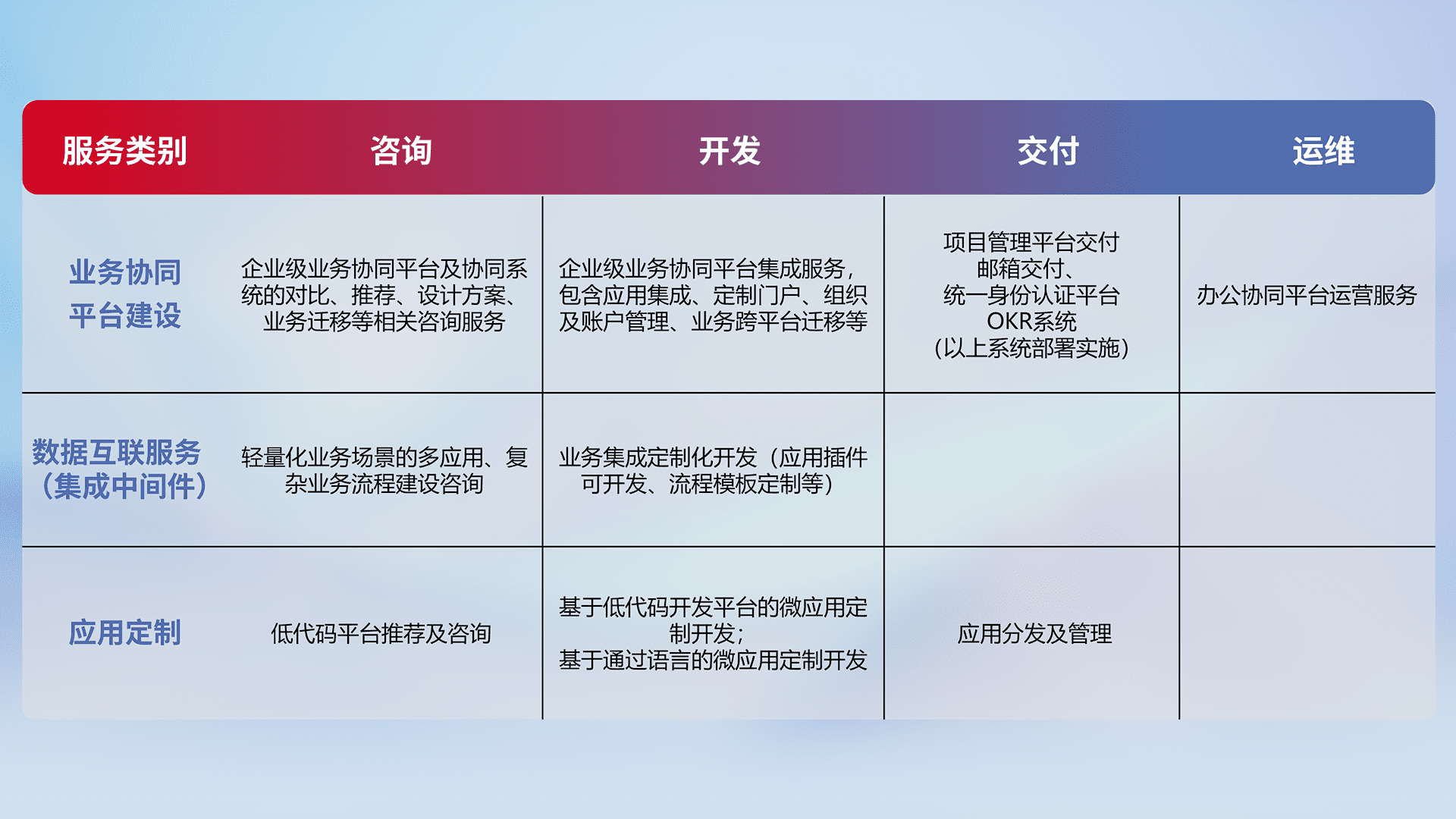针对钉钉、、、、企微、、、IDaas等平台级产品提供产品的规划、、、、方案、、、、交付、、、、定制化开发等服务,,,实现如统一协同办公、、智能客户服务、、混合会议管理、、智能数据查询、、、、等业务场景,,,实现数字化转型。。。。